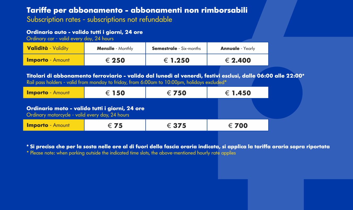 - È possibile sottoscrivere il contratto di abbonamento all’interno del parcheggio e ritirare la tessera di abbonamento nelle date opportunamente comunicate.