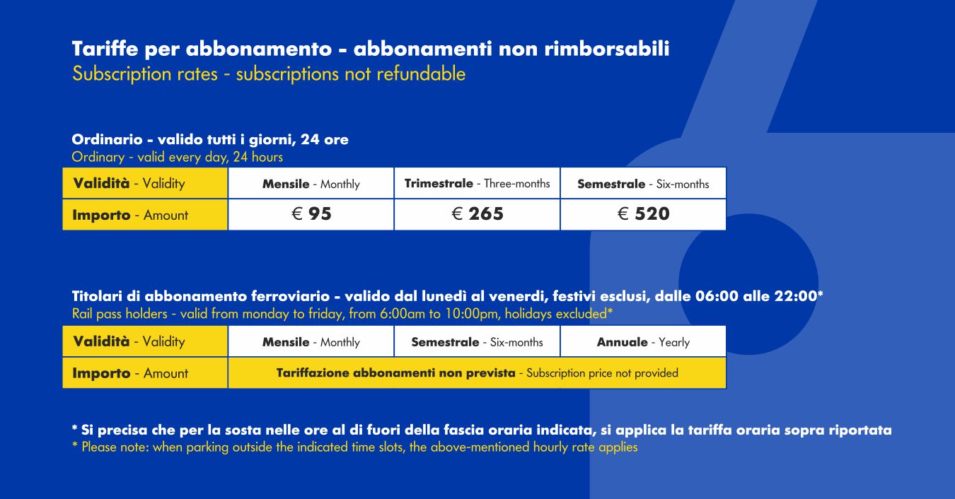 - È possibile sottoscrivere il contratto di abbonamento all’interno del parcheggio e ritirare la tessera di abbonamento nelle date opportunamente comunicate.