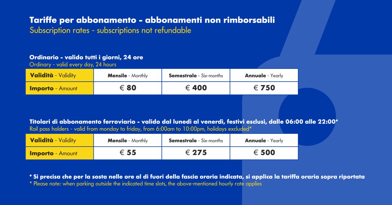 - È possibile sottoscrivere il contratto di abbonamento all’interno del parcheggio e ritirare la tessera di abbonamento nelle date opportunamente comunicate.