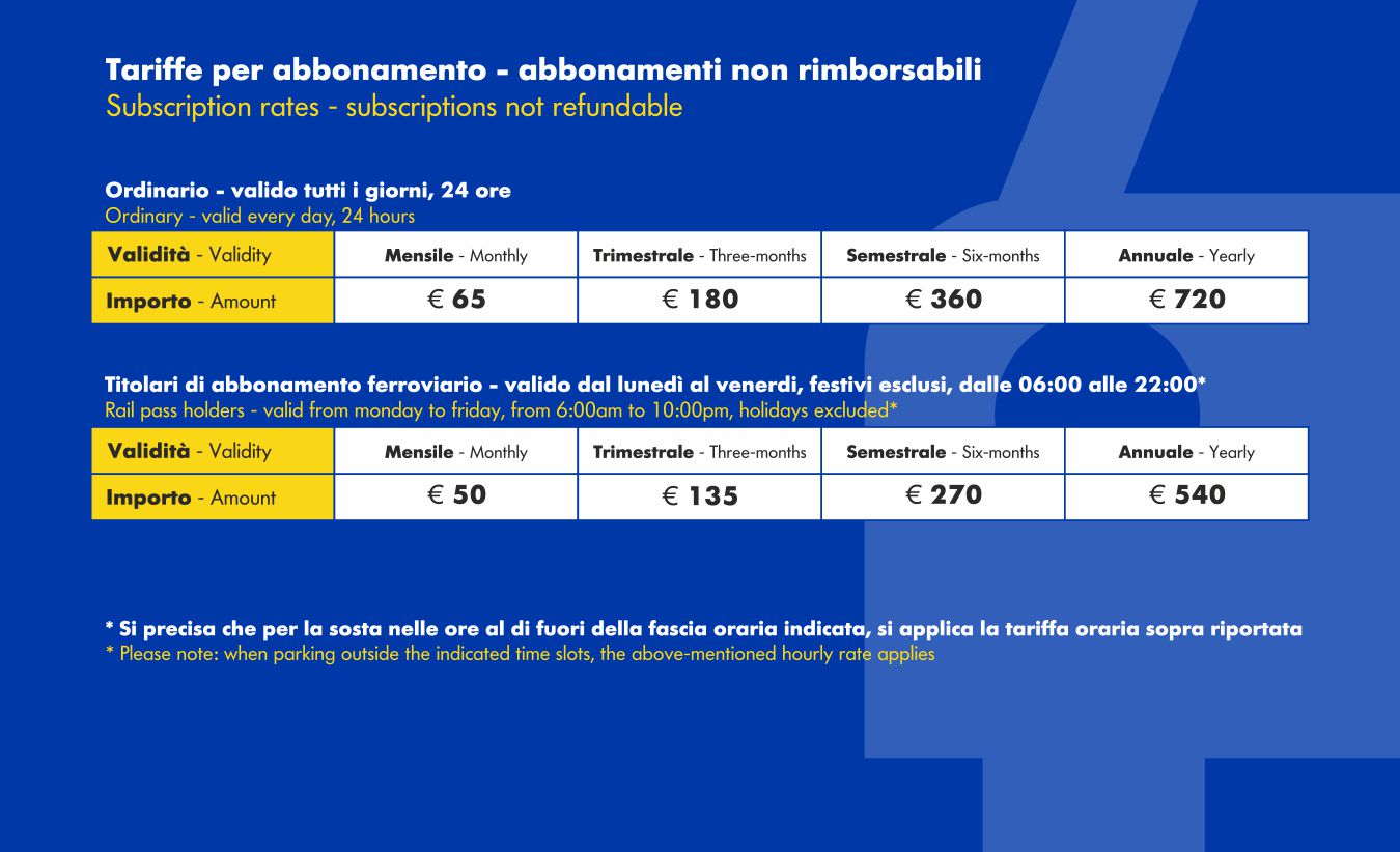 - Il numero di abbonamenti è condizionato alla capacità del parcheggio e in caso di richiesta superiore al numero massimo concesso è prevista una lista d’attesa in ordine di arrivo